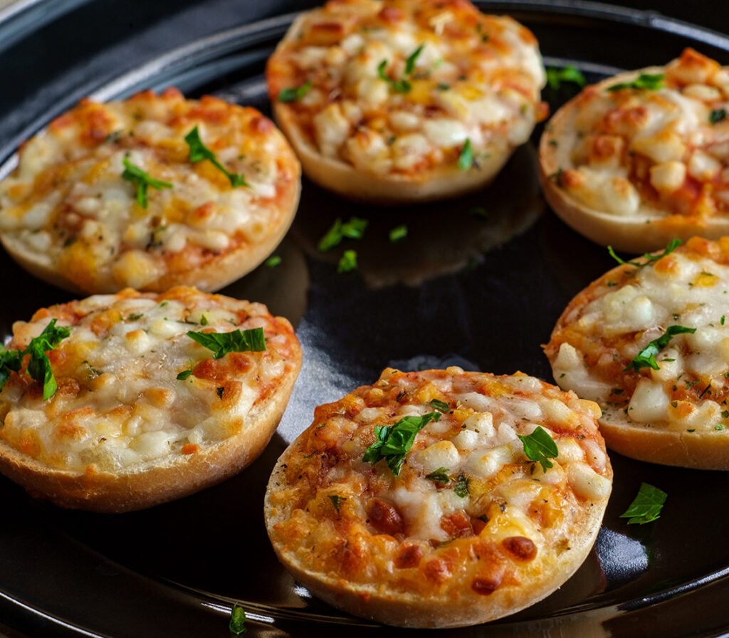 Half of a pizza bagel made with low-fat mozzarella cheese